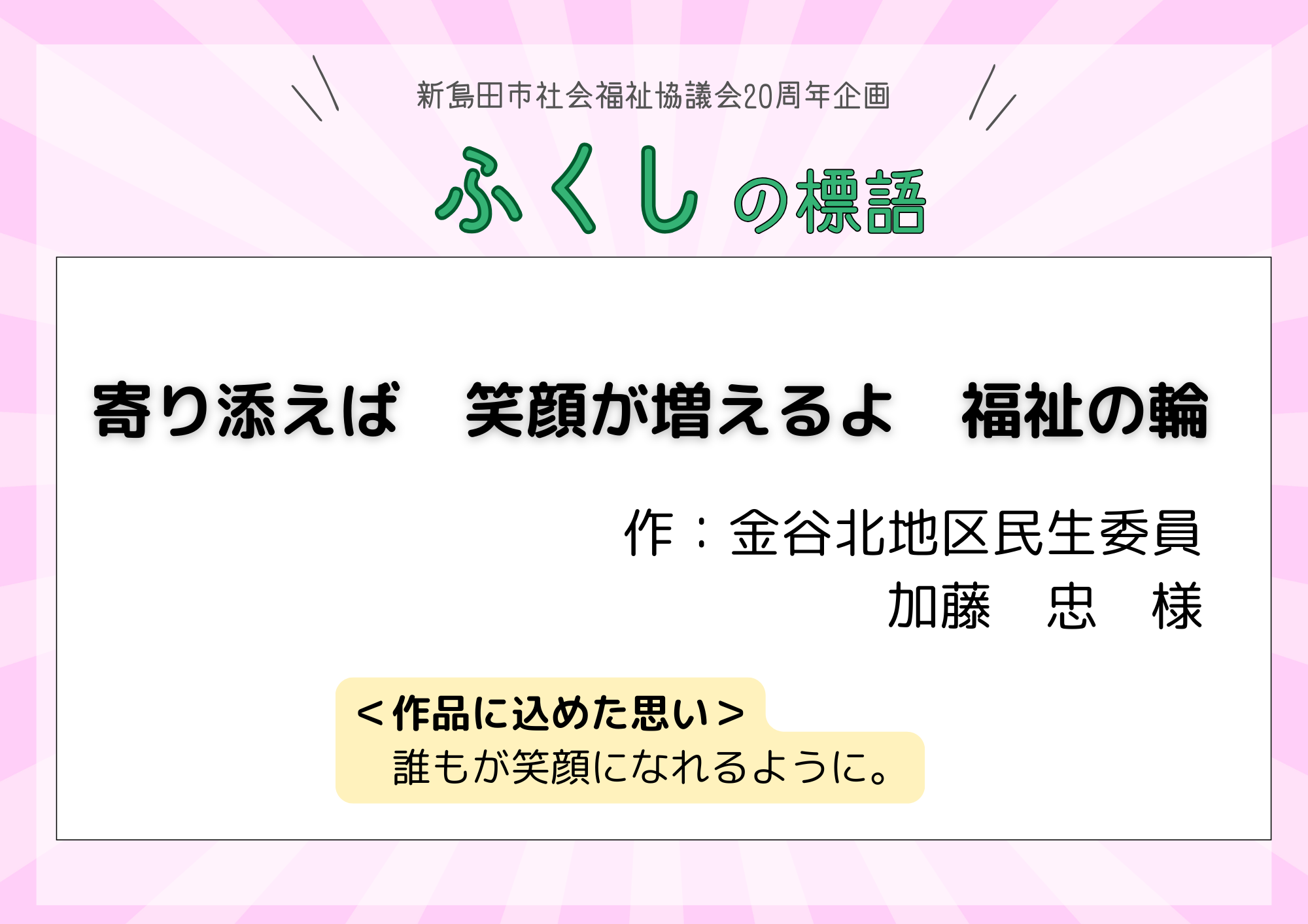 そこで、皆さまから投票いただきました「ふくしの標語」が決定しましたので、ご報告です!